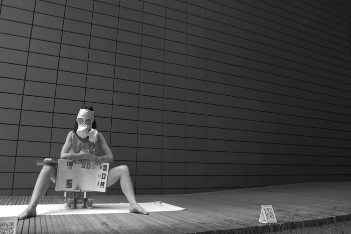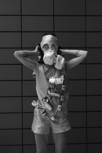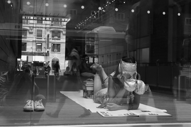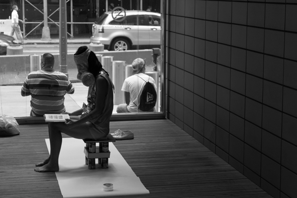 The final hours of Balancing Act were performed on August 29, 2013, Anita’s Way at 42nd Street NY, NY. After over 12 hours of balancing metal leafed Mott’s applesauce cups, silver juice pouches, two feathers, 4 hanks of beads, Our Aesthetic Preferences (Sianne Ngai), Who Sings The Nation State (Judith Butler & Gayatri Chakravorty Spivak), The Beast and The Sovereign (Jacques Derrida), The Art of Color (Johannes Itten), and Art History (Marilyn Stokstad) and reading from the listed books, I dropped the act. I fashioned silver belts to carry the applesauce cups and juice pouches, tied the feathers to my gold brocade gas mask and sat down to really focus.