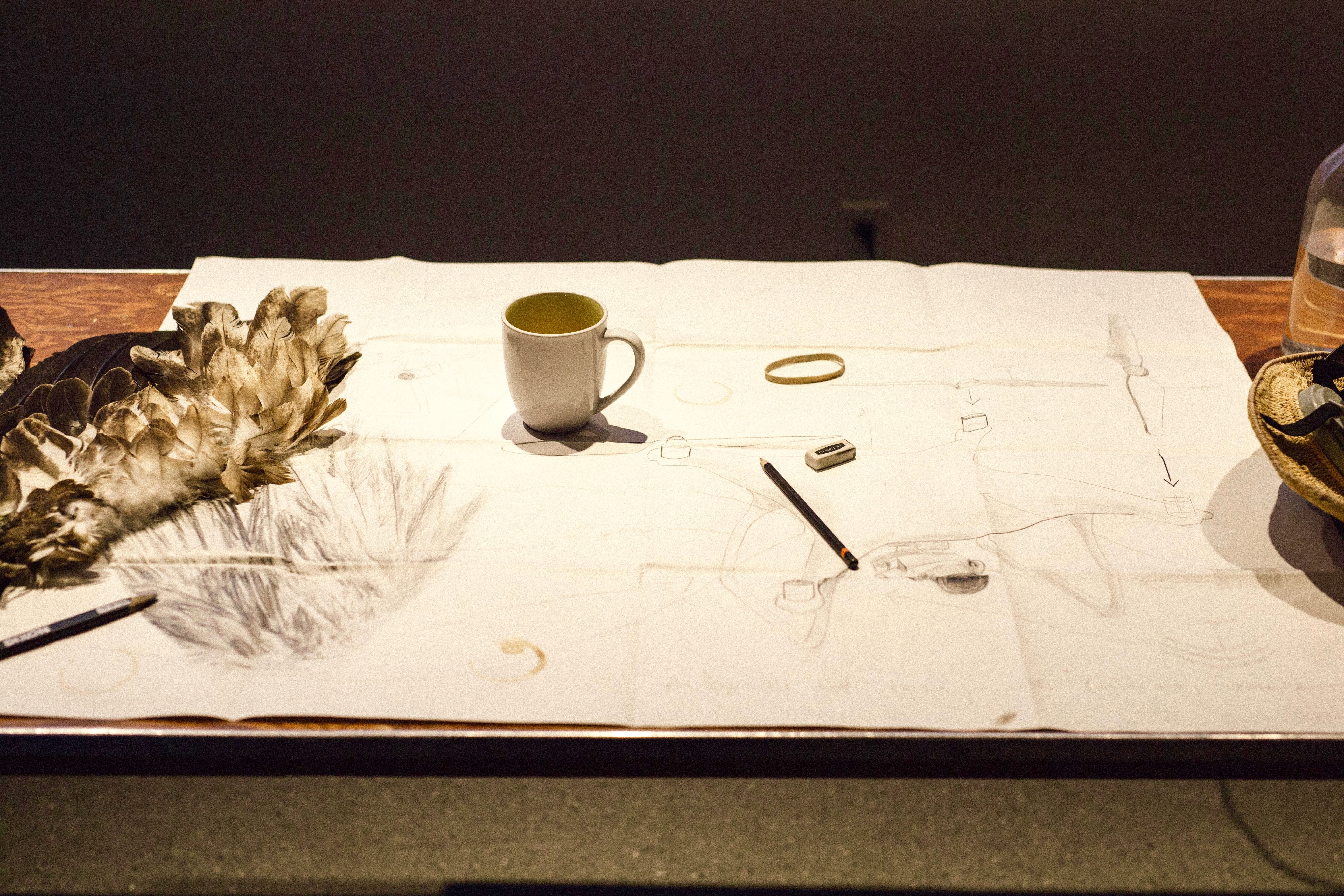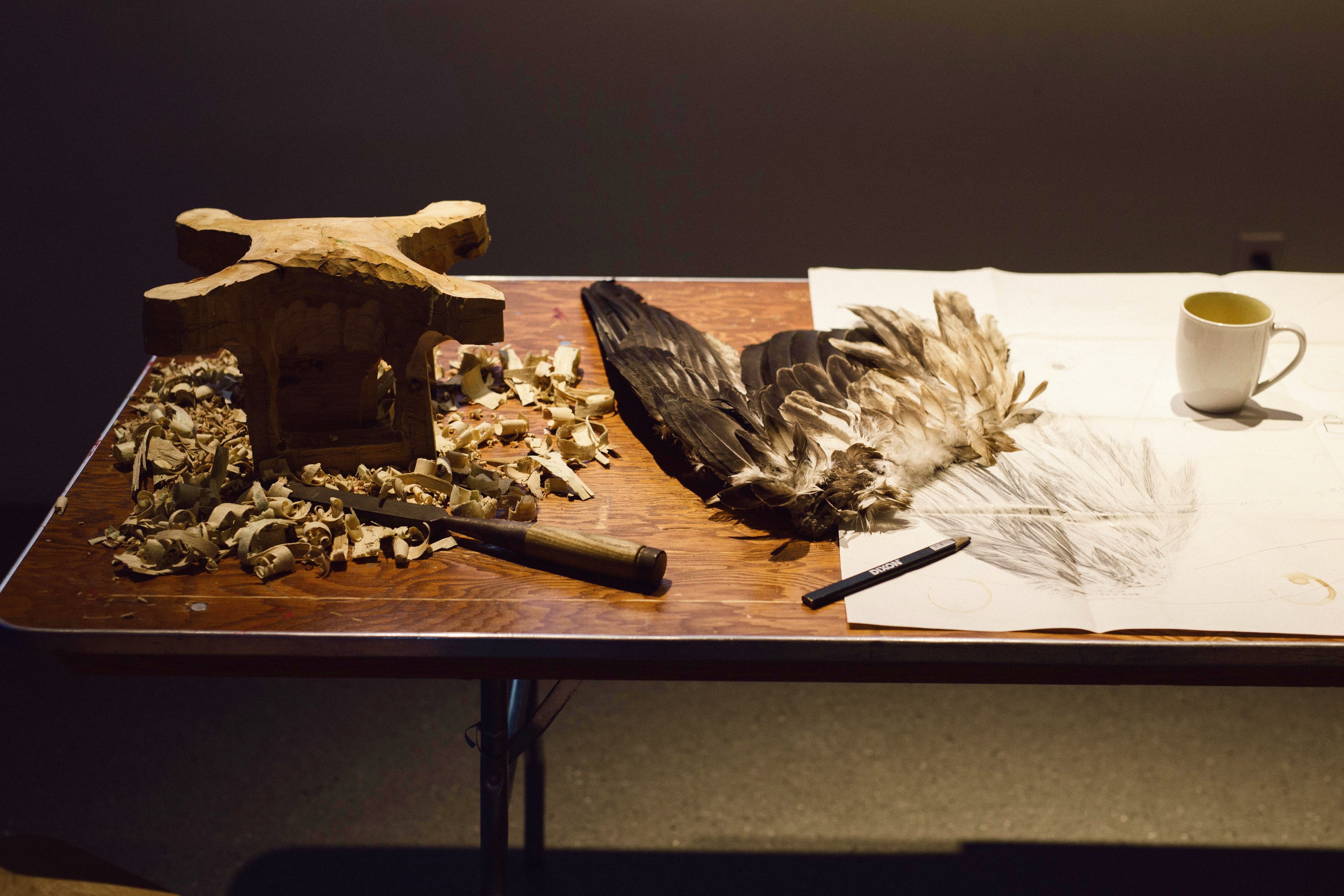 alder, carving tools, wing, drawing tools, graphite on paper, handwoven fiber, respirator, beads, beading tools 2017