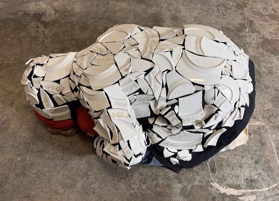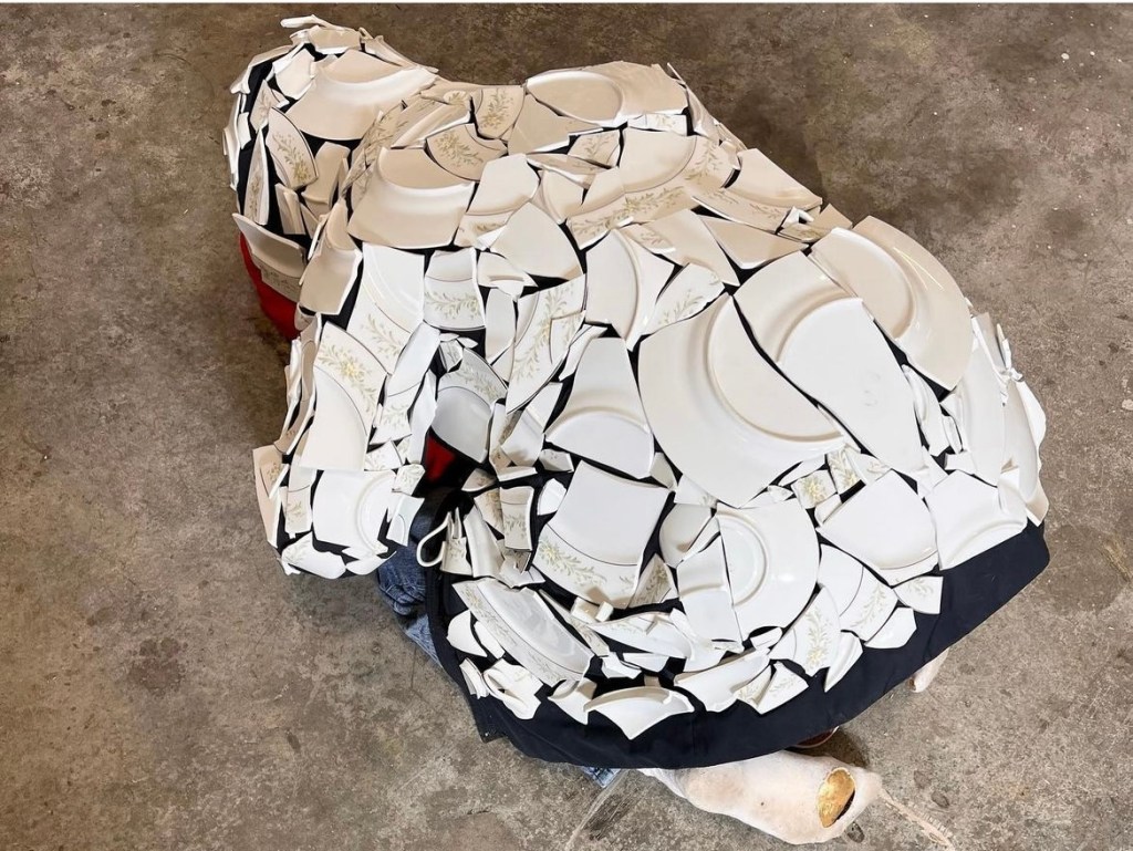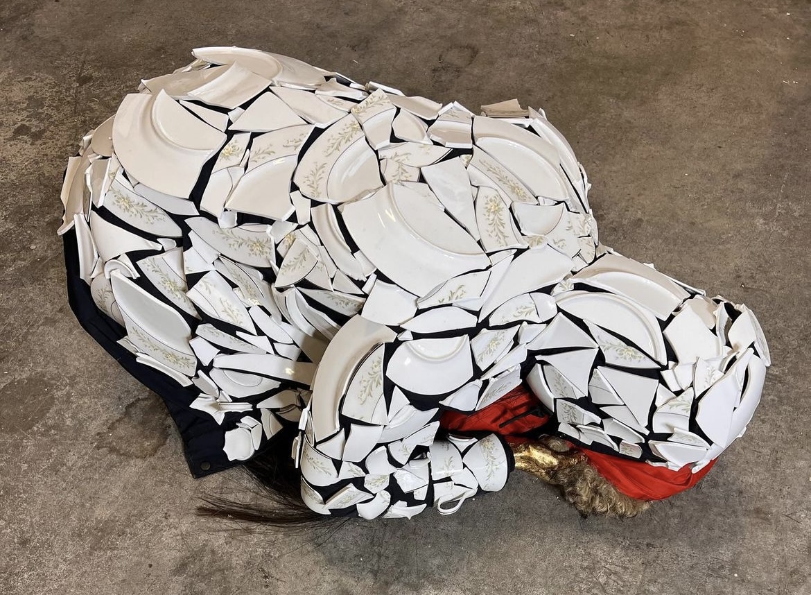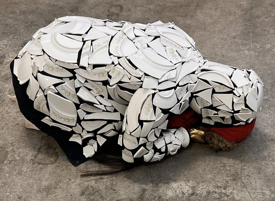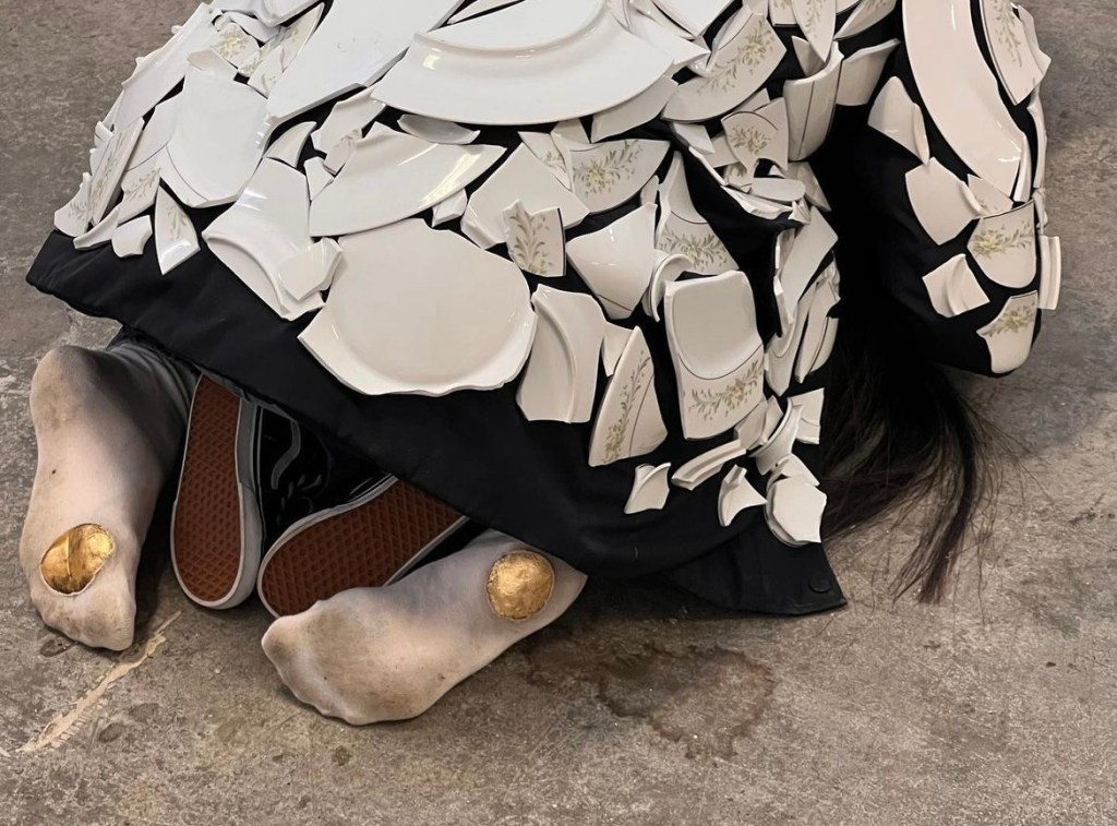 Make a shield (Necessity as a mother) Make a shield (Necessity as a mother) Broken ceramic, clothing, hair, cast hydrostone, metal leaf life size, 2022 Share this: Share on X (Opens in new window) X Share on Facebook (Opens in new window) Facebook Share on LinkedIn (Opens in new window) LinkedIn Share on Reddit (Opens in new window) Reddit Share on Tumblr (Opens in new window) Tumblr Like Loading... Related
