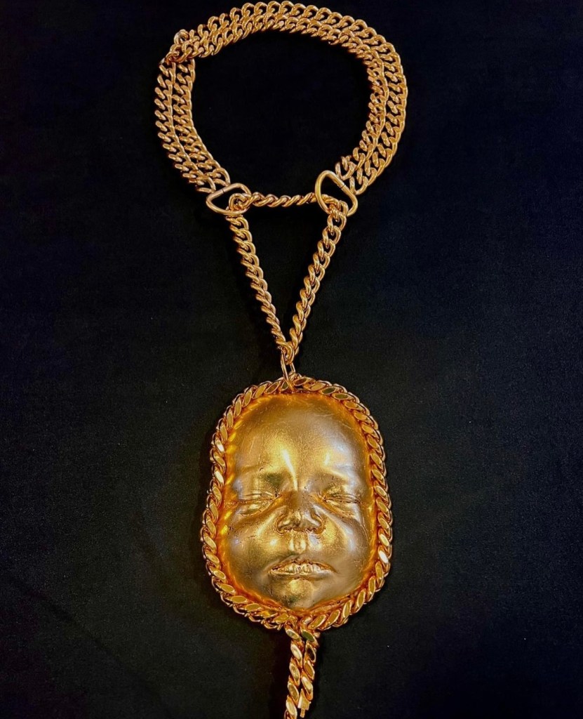 training collar, chain, metal leaf, resin 2023