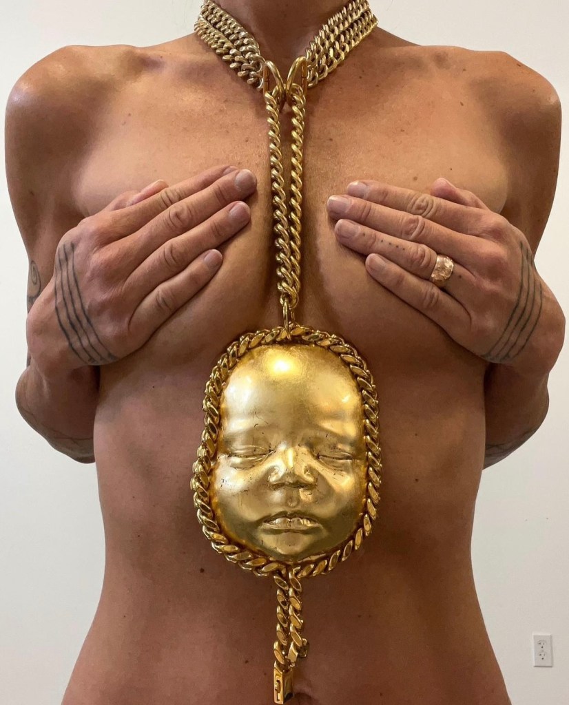 The reproductive training collar is gravity tightened by the weight of a newborn’s face. The collar can be resized to fit the neck of anyone who is, or eventually will be capable of birth. A signal of the wearer’s value as determinate on future or past births as a form of control.