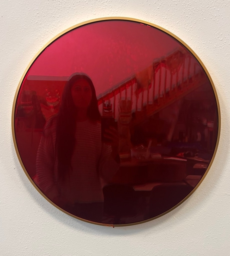 A circular, gold framed mirror filled with mottled transparent red, reflects viewers, surroundings, and passers by. Look, we pool our blood into mirrors is a sublimation of rage and grief. We and our- as in everyone living and being bled; (and also) as in- everyone drawing blood. (Everyone- as in every one alive, every one who has been bled to death, not limited to human form.) In looking, the viewer sees themselves and where they stand, slightly blurred, soaked red even at a distance.