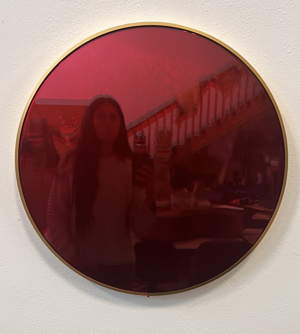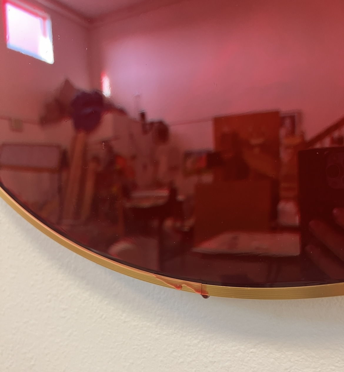A circular, gold framed mirror filled with mottled transparent red, reflects viewers, surroundings, and passers by. Look, we pool our blood into mirrors is a sublimation of rage and grief. We and our- as in everyone living and being bled; (and also) as in- everyone drawing blood. (Everyone- as in every one alive, every one who has been bled to death, not limited to human form.) In looking, the viewer sees themselves and where they stand, slightly blurred, soaked red even at a distance.